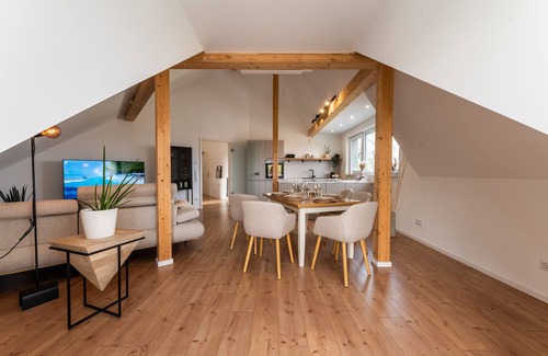 The holiday apartment N8quartier is located in Bannewitz and is the ideal accommodation for a relaxing getaway. The 3-storey property consists of a living room, a kitchen, 3 bedrooms and 2 bathrooms and can therefore accommodate 6 people. Additional amenities include Wi-Fi, a TV as well as air conditioning. A baby cot is also available. This vacation rental features a private balcony for your evening relaxation.