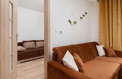 The apartment has a functional interior and a well thought-out layout with the possibility of accommodating 6 people - great for families! The unique design of the apartment is characterised by the arrangement and decorative elements in warm tones - reminiscent of the sunny beaches of the Baltic Sea. The accommodation consists of a spacious living room, kitchenette, bathroom with shower and two bedrooms. The master bedroom has a double bed and a spacious wardrobe. The second bedroom has a comfortable sofa bed and a desk with chair - a comfortable place to work remotely or study. The living room also has a comfortable sofa bed. Even inside the apartment, guests can enjoy the seaside atmosphere by relaxing on the balcony with garden furniture - ideal for relaxing on warm summer evenings. The living room, with sofa and flat screen TV, is the perfect place to relax and watch a film. The wide range of amenities and the fact that the apartment is fully equipped with all the necessary kitchen and bathroom accessories and equipment ensure a comfortable stay. Multimedia facilities include free Wi-Fi and a flat screen TV. The apartment is ideal for any type of stay, especially if you appreciate being close to nature and beautiful interiors. Complimentary toiletries, towels and bed linen are provided for a good start to each night's stay. Parents travelling with a child can also book a cot for their little one. The apartment also comes with a private parking space in the outdoor car park, which is especially convenient during the holiday season.