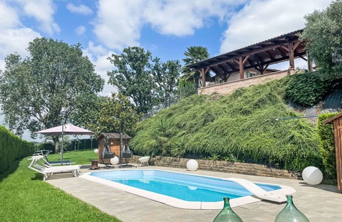 Cosy 3-family house, 2 storeys, surrounded by fields and vineyards. Outside the resort, 2 km from the centre of Portacomaro, in a quiet, sunny position on top of a hill. For shared use: natural state property 1'500 m2 (fenced) with lawn and trees, swimming pool (11 x 4 m, depth 150 cm, seasonal availability: 01.May. - 15.Oct.). Outdoor shower, terrace, garden furniture, parking at the house on the premises. Grocery 2 km, supermarket 5 km, restaurant 1 km, bakery 2 km, bus stop 1.6 km. Nearby attractions: Asti 12 km, Turin 50 km, Alba 35 km. Please note: car recommended. Owner lives in separate semi-detached house. The owner has a dog.