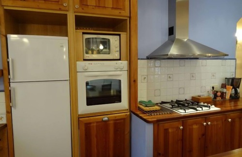 3-room apartment 90 m2 on 3rd floor. Comfortable and rustic furnishings: living/dining room with 1 sofabed (120 cm, length 180 cm), dining table, digital TV and hi-fi system. 2 rooms, each room with 1 french bed. Open kitchen (4 hot plates, oven, dishwasher, microwave). Bath/bidet/WC. Gas heating. Balcony. View of the resort and the river. Facilities: washing machine, iron, children's high chair, baby cot for up to 2 year olds, hair dryer. Internet (WiFi, free). HUTG000250