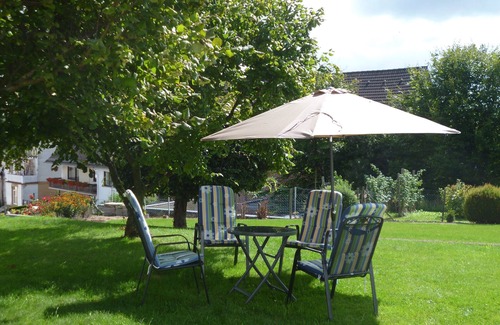 You live in a nicely furnished, 85 sqm apartment on the ground floor with bathroom and separate toilet. Two bedrooms (1 double, 1 single) and a pull-out sofa bed in the living room offer enough space for up to 4 people. Bed linen and towels are included in the price. In the fully equipped kitchen (with dishwasher), you can prepare your meals after an eventful day of vacation, or you can cook yourself in the nearby 'Landgasthof zum Rebstock'. Outside there is a covered seating area with a grill. There is also a parking space in front of the house.