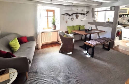 Our holiday apartment, approximately 150 sqm in size, is located in a historic half-timbered house from 1801, lovingly restored and furnished with great attention to detail. A spacious living kitchen with an adjoining sunny roof terrace is situated on the first floor. On the second floor, you will find two large bedrooms, each with a double and a single bed, a central hallway with a home office area, and a bright, beautiful bathroom. Another single bed is located in the attic.