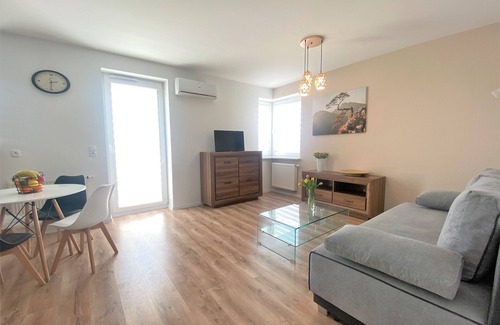 The interior has been tastefully arranged in a modern style. The kitchenette, connected to the living room, is fully equipped with all modern appliances which allow you to prepare your own meal. The bathroom is equipped with a shower cabin and a washing machine. The bedroom area has a large double bed. Wi-Fi Internet and cable TV are available to guests.