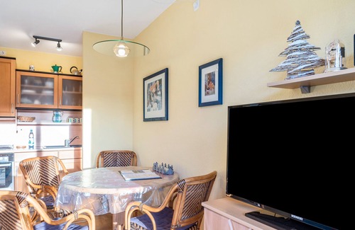 Equipment: Living room: Cozy couch, flat screen TV, radio, dining table with 4 wicker chairs. Bedroom: 2 comfortable trestle beds, closet with full-length mirror, bench. Kitchen: Fully equipped kitchen with crockery, stove with 4 ceramic hobs and oven, fridge with freezer compartment, coffee machine, toaster, kettle, raclette for 2 people. Bathroom: Modern bathroom with shower, WC and hairdryer, towel radiator.
