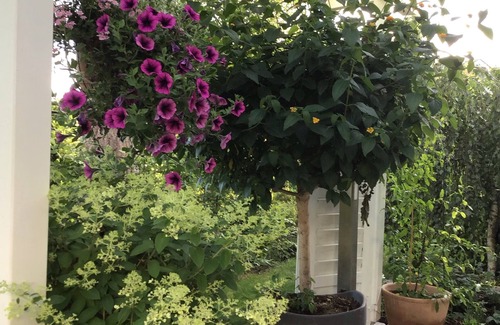 and a small bathroom. In the outdoor area is a beautiful covered terrace that invites you to feel good. For the transitional and cold days you have a Swedish stove available.