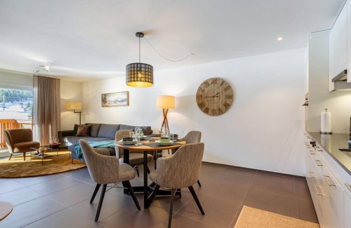 "Verena", 3-room apartment 68 m2 on 1st floor, south facing position. Spacious and bright, very modern and cosy furnishings: open living/dining room with dining table and cable TV (flat screen). Exit to the balcony. 1 large room with 1 double bed (2 x 90 cm, length 210 cm). 1 small room with 2 beds (90 cm, length 200 cm). Exit to the balcony. Open kitchen (oven, dishwasher, 4 ceramic glass hob hotplates, toaster, kettle, electric coffee machine, Capsules for coffee machine (Nespresso) extra, steamer, raclette grill, fondue Set (cheese)). Shower/WC. Underfloor heating. Large balcony, south facing position. Balcony furniture. Marvellous panoramic view of the mountains and the countryside. Facilities: children's high chair, hair dryer. Internet (WiFi, free). Parking (roofed). Please note: non-smokers only.