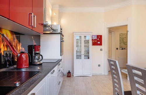This accommodation offers access to a shared outdoor area with a pool, a large garden, a covered terrace, and a barbecue area. You are only a 5-minute walk from the city center and close to the Thüringen-Therme. The Logenhaus, a night and garden lounge bar as well as an event venue, is also nearby. Public transport is within walking distance. A secure parking space can be provided on request, and free street parking is available. One pet is allowed for an additional fee. Smoking and unauthorized parties are not permitted. After booking, please complete the contact form that will be sent to you and provide your address so the host can best prepare for your stay.