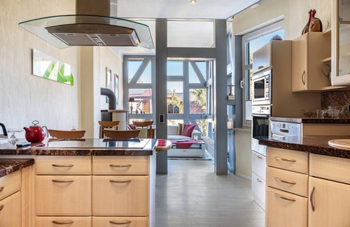 A comfortable box-spring bed also awaits you in the second bedroom, which invites you to dream with indirect lighting and a fascinating starry sky. The open-plan living and kitchen area offers a wonderful view of the well-tended garden through the large glass fronts. A fireplace provides a cozy atmosphere and pleasant warmth on cooler days.