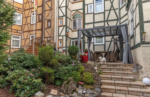 This accommodation offers access to a shared outdoor area with a pool, a large garden, a covered terrace, and a barbecue area. You are only a 5-minute walk from the city center and close to the Thüringen-Therme. The Logenhaus, a night and garden lounge bar as well as an event venue, is also nearby. Public transport is within walking distance. A secure parking space can be provided on request, and free street parking is available. One pet is allowed for an additional fee. Smoking and unauthorized parties are not permitted. After booking, please complete the contact form that will be sent to you and provide your address so the host can best prepare for your stay.