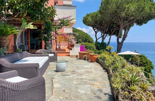 "WeSea", 4-room apartment 140 m2 on 2 levels. Bright, fully renovated, tasteful and stylish furnishings: living/sleeping room with panoramic window with 1 double sofabed and digital TV. Exit to the garden, to the terrace. 1 double bedroom. Exit to the terrace. 1 double bedroom. Shower/bidet/WC. Heating, air-conditioning. Heating available only from 15.10. to 15.04. On the lower ground floor: large kitchen-/living room (4 hot plates, oven, dishwasher, toaster, kettle, microwave, freezer, electric coffee machine) with satellite TV. Exit to the garden, to the terrace. Shower/WC. Parquet floors. Large terrace, garden 400 m2, porch. Terrace furniture, barbecue, deck chairs. Very beautiful panoramic view of the sea and the town. Facilities: washing machine, baby cot. Internet (WiFi, free). Parking (fenced 1 car). Not suitable for small children. IT009065B4STA96J7D