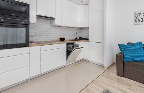 This comfortably designed and furnished apartment has the capacity to accommodate up to 4 people. The area of the apartment is divided into a spacious living room with a kitchenette and an exit to the balcony, a bedroom and a bathroom with a bathtub with a shower function. The interior is decorated in light, warm colours, making the apartment cosy and making you feel at home. A desk with a chair is available in the bedroom, which, combined with the available WiFi internet, allows you to work remotely or study freely. The apartment is fully equipped (oven, dishwasher, washing machine, flat screen tv) for a comfortable stay. The flat has a balcony overlooking a quiet part of the city, and with the available garden furniture, guests can start their day with a cup of coffee or tea.