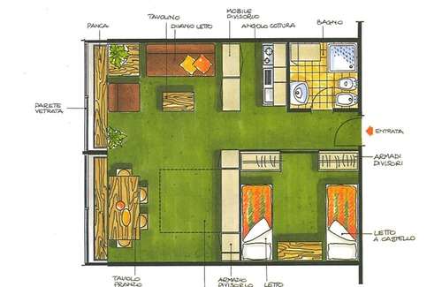 Rent in Marilleva, 6 bed apartment consisting of a living room with sofa bed and foldaway bed, room with three beds, kitchenette and bathroom, Inside the tourist complex there are multiple services.