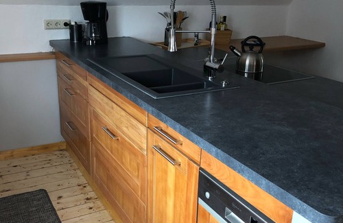 In the 1. Floor is a fully equipped solid cherry wood kitchen. This former seminar kitchen offers plenty of space for cooking together. It is equipped with an induction cooker (90cm), a microwave with grill and a Thermomix