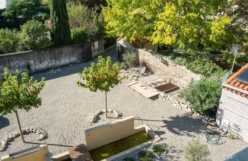 Our large graveled courtyard with water basin, various sun and shade areas, as well as a covered summer kitchen and Mediterranean shrubs is available to everyone. We think that a maximum of 3 cars should be parked there, otherwise access only for loading and unloading!