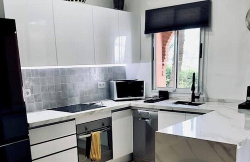 Luxury apartment in the Palmeraie de Marrakech, with 2 spacious bedrooms, bright living room and 2 modern bathrooms. Centralized air conditioning and private garden with barbecue Residents have access to 4 swimming pools and a pergola to relax al fresco. Located in a quiet and green setting, this apartment combines modern comfort and serenity, offering a unique experience for a refined stay in Marrakech.