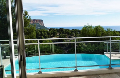 Nouveau !! Appartement au rez de chaussée de la maison, donnant sur la piscine à débordement chauffée dès le mois d'avril . Vues mer et Cap Canaille exceptionnelles .Décoration soignée, terrasse privative , solarium de 300 m2 autour de la piscine , exposition plein sud. Cuisine équipée, salon séjour ,belle salle de bain à l'italienne, deux chambres très confortables. Parking gratuit et facile devant la maison. Barbecue privatif à côté espace terrasse et coin repas extérieur.