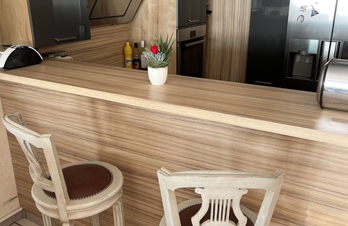 The apartment consists of an open-plan kitchen with a counter opening onto the living area. You’ll find all the necessary amenities for your comfort: coffee machine, toaster, kettle, oven, microwave, American fridge, and all the kitchen utensils to prepare delicious meals.