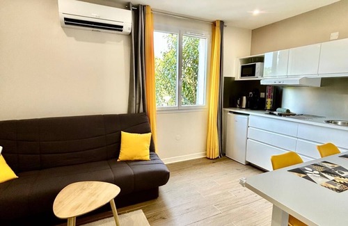 Large screen TV/ free wifi/ Reversible air conditioning. A small coffee/tea are at your disposal. Bed and toilet linen and cleaning are included. Miscellaneous equipment: kitchen (coffee maker Dolce Gusto, microwave, refrigerator, utensils kitchen and crockery for 4 people, 2 burners induction hob, sink…) living room (sofa bed, dining area and kitchen) Bathroom (towel dryer, hair dryer, magnifying mirror and single-storey mirror, etc.)