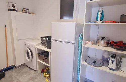 Une grande pièce à vivre, TV, cuisine équipée et buanderie.