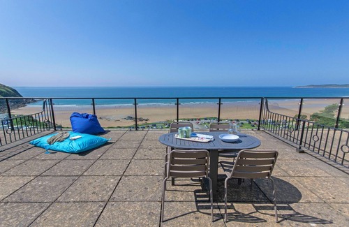 French doors to the patio area with furniture and outdoor bean bags that overlooks Putsborough beach with spectacular views of the sea, cliff face and beach.