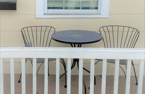 Walk up 4 steps to a porch with small table and chairs for relaxing outside. Enter into a brightly lit living room with high ceilings and 2 large windows, large sleeper sofa, TV with Roku, coffee table, and desk/work area. Next enter into the bedroom which has a queen bed, Roku TV, and large chest of drawers. Down the hall from this bedroom is a full bathroom, and small kitchen with dining area. The washer and dryer are located in a closet adjacent to the dining area.