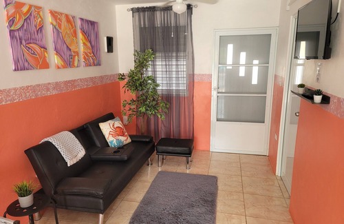 These fully furnished apartments were carefully designed to offer you the best comfortability while vacationing. Equipped kitchen, WIFI Roku TV's within every room, air conditioned bedrooms, amazing private porches along with themed beautiful murals (designated smoking area), and a designated private parking area. Located ONLY 5 MINUTES FROM THE BEACH, is insurring you receive the best lodging experience while adventuring this carribean island. Enjoy and relax on the top lounge area (common area), decorated beautifully with an amazing mural. This area consists of patio lounge chairs, couch, reclining sun bathing chairs, and a hammock. Or challenge friends & families with our large size outdoor games on our deck with sitting area/umbrella. Equipped with sun bathing lounge chairs throughout, relax and take a dip in the crispy refreshing pool. All units are equipped with pool towels for all guests.