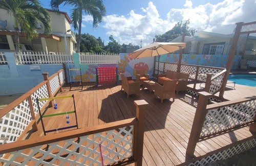 These fully furnished apartments were carefully designed to offer you the best comfortability while vacationing. Equipped kitchen, WIFI Roku TV's within every room, air conditioned bedrooms, amazing private porches along with themed beautiful murals (designated smoking area), and a designated private parking area. Located ONLY 5 MINUTES FROM THE BEACH, is insurring you receive the best lodging experience while adventuring this carribean island. Enjoy and relax on the top lounge area (common area), decorated beautifully with an amazing mural. This area consists of patio lounge chairs, couch, reclining sun bathing chairs, and a hammock. Or challenge friends & families with our large size outdoor games on our deck with sitting area/umbrella. Equipped with sun bathing lounge chairs throughout, relax and take a dip in the crispy refreshing pool. All units are equipped with pool towels for all guests.