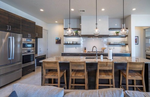This gorgeous villa boasts one of the best poolside locations Arcadia has to offer. Right off the patio of this home is incredible Arcadia Resort pool, amenity area, and clubhouse. Find a water slide, lazy river (one of the largest in southern Utah), 2 large pools, 2 hot tubs, 2 pickleball courts, cornhole, a gazebo, and fire pit. Within the walls of the clubhouse is more FUN – Games, NBA Hoops arcade, foosball and more! Maybe your days will be spent at the pool, but your evenings can be spent relaxing at this well-equipped villa. Sit back and kick your feet up in one of the 2 spacious living areas or enjoy your dinner on the covered patio overlooking the pool. This home is perfect for families, groups, corporate events, or reunions.