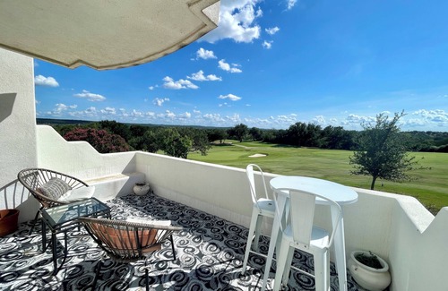 Stay in a work of art by world-renowned architect José Luis Ezquerra! This private villa in a 'castle' is a piece of history on the Apple Rock golf course. Experience its famous brick dome ceiling–handcrafted by master artisans–and the captivating 40ft spiral staircase. Guests rave about the comfort and stunning balcony sunsets. Watch for the deer that roam the fairway–a tranquil scene the architect himself envisioned–the perfect retreat for your Hill Country golf getaway or romantic escape.