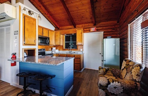 Updated kitchen with new counter tops, well equipped to host 6-7 guests. Great room with TV and dining area - the perfect space to kick back or play board games. This unit also has a great front porch with a grill, picnic table and conversation area. A cozy cabin experience in the city! Close to restraunts, grocery stores and antique shops.