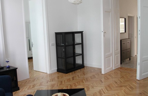 This elegant, luxury apartment is located in the heart of the Budapest overlooking the famous pedestrian thoroughfares Váci street. Two-bedroom apartment for 3 to 6 people with king size beds and bright living room in-between. Sofa in the living room can be turned into a specious bed. Pastel and warm colours of the furniture, help you to feel relaxed. The bathroom has shower, sink, towels and toiletries and can be entered from both bedrooms. The apartment has fully equipped kitchen with oven, stove, dishwasher, toaster, kettle, coffee maker and a table. There is one lavatory room and one bathroom, which makes this apartment more advisable for family stay. The apartment has been completely renovated in 2017.