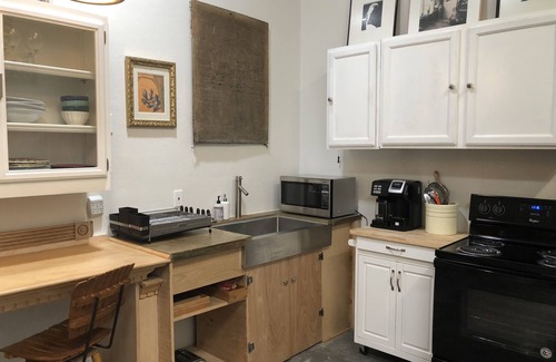 Set on half acre, we’re a wee bit modern with a dash of boho artist. Recently remodeled into an attached guest house (but completely private) it's nearly 850 square feet with 12 ft. ceilings, concrete floors and warm natural light from 2 steel six feet by five feet windows. Wi-fi, Hulu live and many apps, air conditioning and washer/dryer. Has a dedicated large fenced in backyard and we're pet friendly.