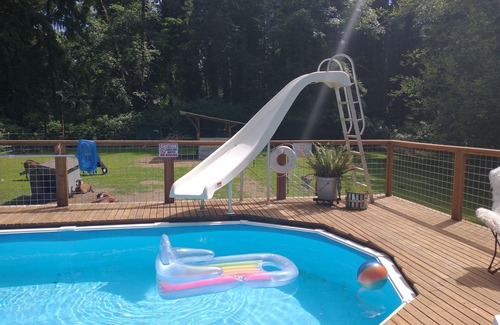 3+ acre patially wooded lot located on our small hobby farm minutes from the ferry and winslow. The entire property is use at you and any of your guests own risk, one of our only requests as landlord (mainly because of the pool and lack of lifeguard) we ask that you sign a waiver/release acknowledging this.