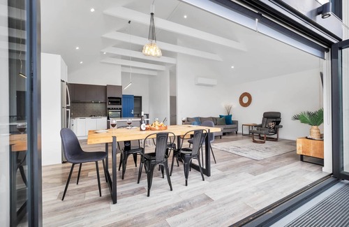 Downstairs, two serene queen bedrooms provide restful retreats. The master boasts a private ensuite, while the second bedroom enjoys direct access to a stylish main bathroom with a deep, freestanding bathtub. Additional features such as reverse cycle air conditioning, full laundry facilities, a convenient powder room upstairs, and ample gear storage ensure every comfort is covered.