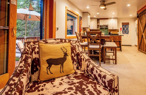 Step inside to vaulted ceilings with exposed beams and a sunlit living room centered around a beautiful wood-burning stove. Curl up on the comfy sofa, enjoy a movie night on the Smart TV, or share meals at the dining table for six.
