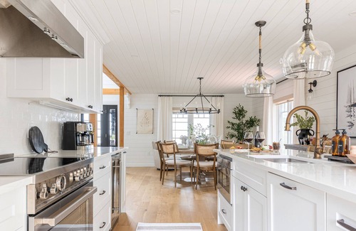 The house, a Cape Cod design, has been newly built with a coastal feel that draws the sea into the house. Shiplapped walls and ceilings, hardwood floors and stunningly furnished for comfort and relaxation. Dining for eight right next to the Chef’s kitchen and kitchen island can make for memorable meal preparation and enjoyment. A wine and beer fridge, ice maker and cocktail shaker set will definitely help set the mood.