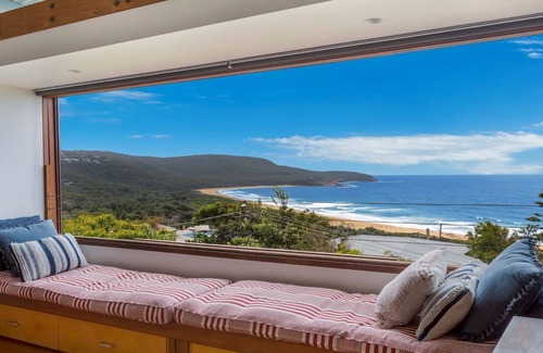 Architect designed contemporary beach house, with panoramic views of the stunning Killcare Beach and Putty Beach. Bordering Bouddi National Park, this house has spectacular bush/beach/ocean views from nearly every room. Large sliding glass doors open the main living area out onto a north facing entertaining deck.