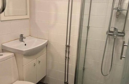 There is one bathroom, which has a toilet and sink and a walk-in shower.