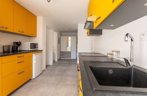 - A kitchen opening onto the living room, equipped with: electric kettle, oven, microwave oven, toaster, dishwasher, hotplates...