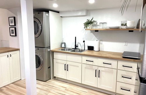 Beautiful, serene suite that is in the lower level of our home. It has a private entrance to a spacious, quiet, restful home. The ceilings are 9’ so it seems larger. There is a large bedroom with a queen bed, night stands and lamps, a closet and dresser to put your things away. In the living room is a very comfortable futon that folds out to a queen bed. There is a washer and dryer in suite as well as a fridge, microwave, toaster oven, induction cooktop, and of course a coffee bar. We include coffee, sugar, cream, tea.