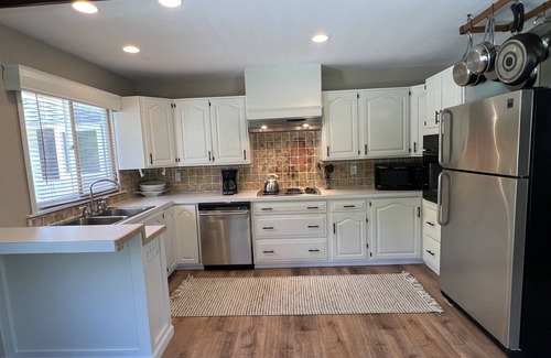 The stylish interior has a cathedral ceiling in the living area. An open floor plan flows easily from the interior to the rear deck down to the patio - providing a comfortable casual ambiance. This home is decorated with flair. There are 2 bedrooms and 2 baths on the main level. The spacious king bedroom is located in an open loft.