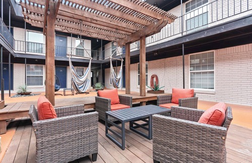 Stay with us and wake up on your comfy king-size gel memory foam mattress in our lux apt just minutes from downtown Austin! Enjoy dinner in the dining area or complimentary coffee/tea on your private balcony. An office space with a balcony view and modern kitchen amenities catered to your needs. Gather around stainless-steel appliances and spacious countertops. Your perfect Austin stay starts here!