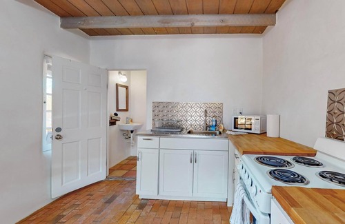 Hidden behind adobe walls, this house is a New Mexico classic, with brick floors, beam ceilings and stained glass. The large bedroom, which features a gas fireplace, looks out onto a private garden. A second large shaded yard offers multiple options for outdoor dining. It's 3.5 miles to Old Town Albuquerque, 2 miles to the trails of the Rio Grande Nature Center and about an hour to Santa Fe. Cozy up by the gas fireplace in the winter and relax on the shady patio in the summer.