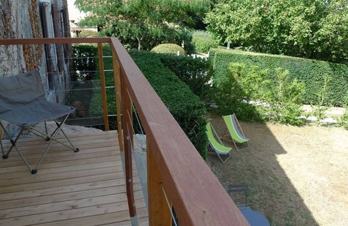 Private terrace overlooking the 400 m² shared enclosed courtyard, a 100 m² private garden 10 m from the kitchen door, and a plancha grill.