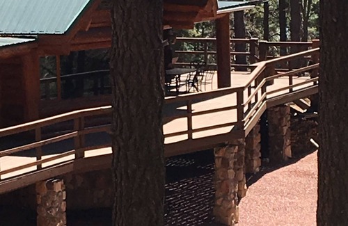 11.5 acres of peace and quiet at 7,095 feet (where the house is) in the cool pines. This 2600 square foot REAL log cabin has 3 bedrooms and 2 bathrooms. Bedrooms 2 and 3 are upstairs and have their own private balconies. Bedroom 2 has a king bed and bedroom 3 is a gym with 2 king size blow up mattress available and shares a Jack and Jill with bedroom 2. The master is also a king bed. There is a Big screen T.V. with surround sound and you will enjoy Direct T.V. and a dvd player. The pad the cabin sits on is fenced to keep unwanted animals out and allowed pets in. We have Wi Fi. The entire cabin has a complete wrap around deck that is absolutely HUGE. You can be in sun or shade any time of the day.