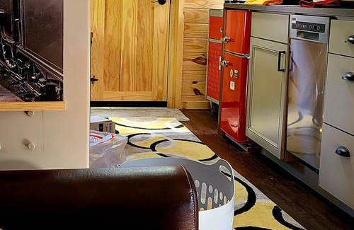 The transformation from hardworking railcar to cozy retreat began in 2022. The loving renovation preserved the caboose's inherent character while introducing all the comforts of home. Step inside, and you're greeted by a thoughtfully designed interior that subtly nods to its 1970s origins. The compact yet efficient kitchen is equipped with everything you need, from a microwave and toaster oven/airfryer to a dishwasher, small refrigerator and coffee bar, all centered around a charming dining table for four.