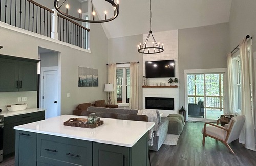 This main level also includes the living room with large Smart TV where you can log in to your Netflix or Hulu accounts! Living room has vaulted ceilings and a beautiful propane fireplace. There are two doors in the living room that open to the deck, where you can BBQ and enjoy the wooded views. There are also two bedrooms and a half bathroom on this level. Main bedroom has a king sized bed has a sliding door for access to the deck as well as an additional private full bathroom!