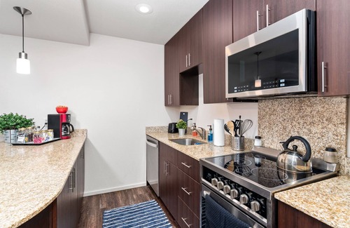 ✔Kitchen: Prepare delicious meals in the fully equipped kitchen featuring sleek countertops, stainless steel appliances, and essential cookware, making dining in a breeze. There is no dining table but the kitchen counter can accommodate up to 2 guests with 2 high chairs in it.