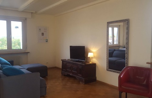 Beautiful, clear and bright apartment of almost 100 m2 on the second floor of a small building, ideally located 5 minutes from Basel and Germany. Very close to the verdant White Water Park of Huningue. Shops and transport (tram, bus, train station, taxi) nearby. Basel-Mulhouse Airport 15 minutes away. Wooded garden and private parking. Many sports and cultural activities in the region.