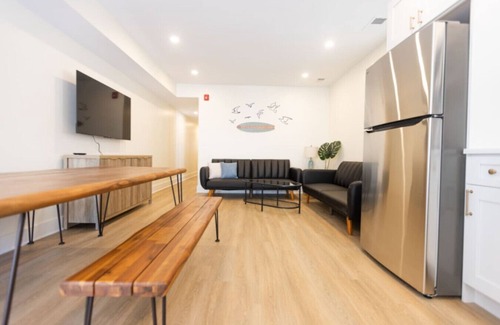 Fully renovated 3BR, 1BA condo, sleeps 6 plus two sofa beds in the living room, that make it 8 people max.Condo was gutted to studs. Brand new floors, paint, kitchen w/ quartz counters, and modern furnishings. Beautiful tiled bath w/ tub. Fully equipped kitchen: teapot, coffee maker, toaster, cookware, and utensils. Just 200 ft from the beach in Wildwood, NJ. WiFi, linens provided, beds made (except sofa). Free on-site washer/dryer. Parking permit included for metered street parking (no lots).